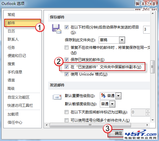 在选项窗口左侧单击“邮件”,从右侧细节窗口中找到并勾选“在已发送邮件文件夹中保留邮件副本”。
