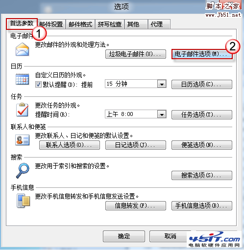 在“首选参数”选项卡上单击“电子邮件选项”按钮。
