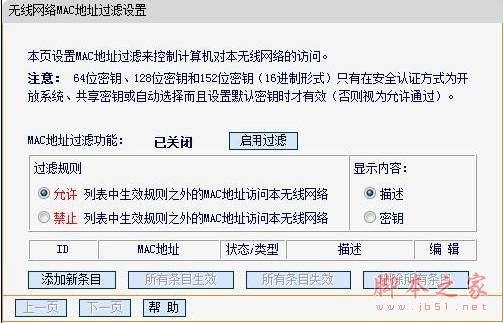 通过有线登陆路由器管理界面,“无线参数(无线设置)”-“MAC地址过滤”,确认其为关闭状态。