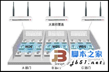 上图所示为一小型企业无线网络,A、B、C三个部门如果只使用1个无线路由器(本文以MW300R为例),可能会出现一些计算机搜到信号很弱或者搜索不到信号,导致无法连接无线网络。解决方法是:A、B、C三个部门各自连接一台无线路由器,三个无线路由器通过WDS连接就可以实现整个区域的完美覆盖、消除盲点。