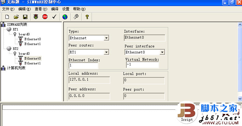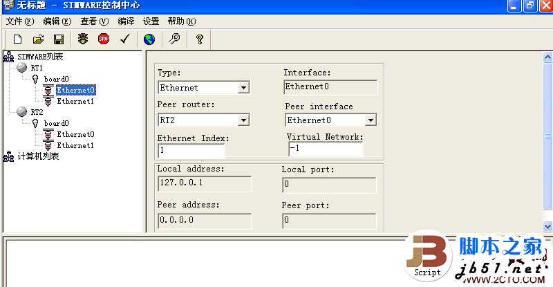 13、右击SIMWARE列表,再添加一台路由器(RT2),添加board0(可看到RT2的board0的console Port号是2001),也让这台路由器有两个接口,接口类型也是Ethernet。选择路由器RT2的Ethernet0接口,Peer router 选择RT1,Peer interface 选择Ethernet0。