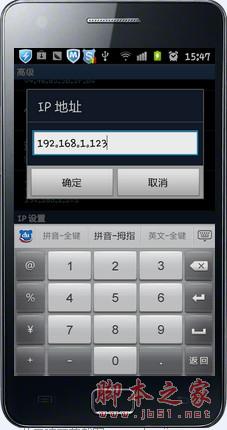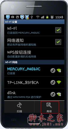 STEP1:手机无线连接上无线路由器之后,按键“MENU”菜单键,弹出“高级”按钮。点击“高级’,弹出手机IP地址配置页面。