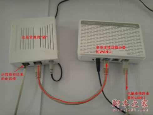 ADSL线路实物连接图(如果是小区宽带,直接把宽带线连接到WAN口就好了)