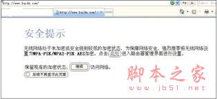 步骤三:试试无线可以上网了吗?按照步骤二的方法将您的电脑通过无线的方式连接到路由器后,就可以上网了。如果电脑在打开网页时有如下页面的"安全提示"信息,表示您的无线没有进行加密或者没有选择足够安全的加密方式,请按该页面的提示设置无线安全。