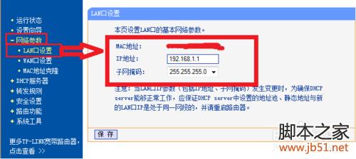如图,找到“网络参数”----“LAN口设置”,可以看到这是有线路由器的IP地址,注意这个ip地址,在无线路由器中设置静态IP时需要用到路由器的这个IP地址。