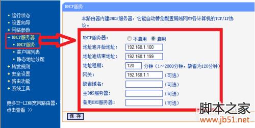 如图,点击DHCP服务器-----DHCP服务器,可以看到连接到有线路由的设备(电脑或路由器)将获取的IP地址的范围。