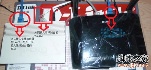 外网的进线接入有线路由的WLAN口或Internet口,从有线路由器的lan口接入一个网线,另外一头插入无线路由器的WLAN口或Internet口,如图所示