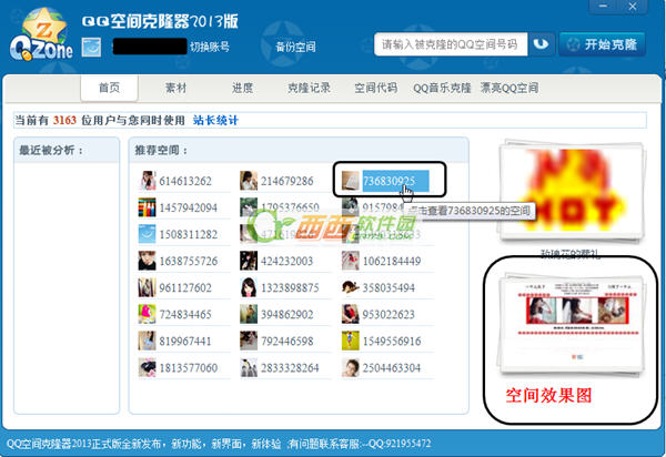 登陆后,在首页我们可以看见软件推荐的一些QQ空间达人的空间,大家可以先看看别人的效果,空间效果在右边显示哦,不过有点小,