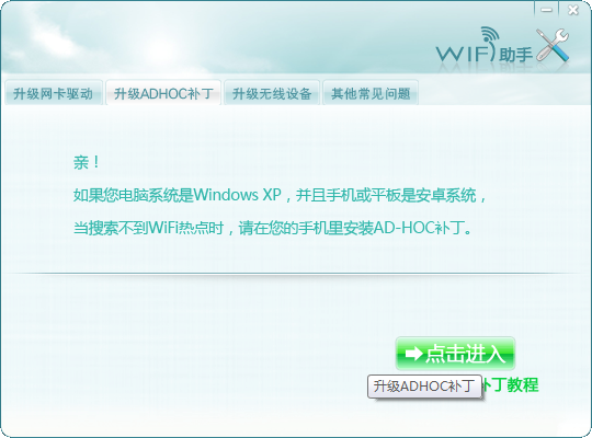 3、如果是XP系统的电脑,无法启动时候点击wifi助手选择安装ADHOC补丁来尝试解决问题。