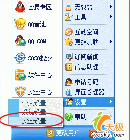 1. 点击QQ主菜单,在其中找到“设置”→“安全设置”一项,启动“安全设置”对话框。如图1所示