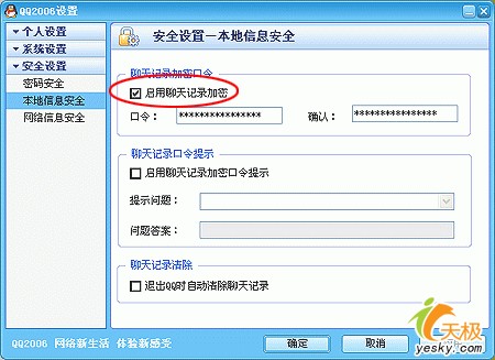 2. 在弹出的安全设置对话框中点击“本地信息安全”标签,然后再勾选右侧窗格的“启用聊天记录加密”复选框,设置好记录加密密码后点击“确定”按钮。如图2所示