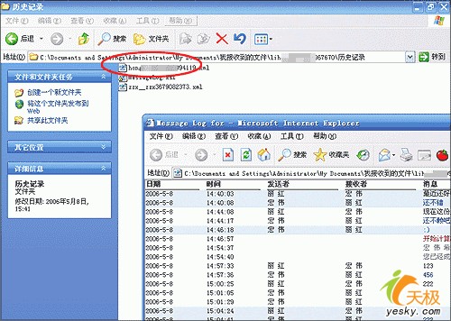 相比QQ来说,MSN的加密设置可就没有这么容易了。因为直至MSN的最新版本Windows Live Messager 0689版为止,我们也没有看到任何关于聊天记录加密的功能。任何人只要进入聊天记录的文件夹,再双击相应的聊天记录文件,就能直接用IE查看具体的聊天内容了,可以说是“一览无遗”。如图4所示