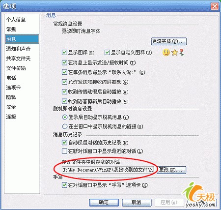 1. 首先,在MSN选项窗口中点击“消息”标签,然后在“在此文件夹中保存我的对话”项目中查询聊天记录的具体保存位置。如图5所示