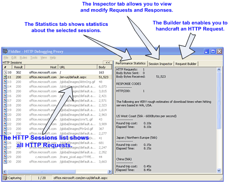 Fiddler可以帮您记录,调试Microsoft Internet Explorer与Web应用程序的交互,找到Web程序运行性能的瓶颈,还有如查看向Web服务器发送cookies的内容,下载内容的大小等功能。