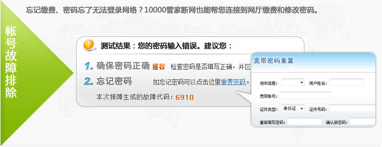 如您上网遇到问题,可以不必拨打10000号,直接使用排障功能,排查网络故障并修复。如是欠费了,密码忘记了,您可以通过帐号排查功能实现断网也能续费、重置密码等操作。还可以通过10000管家,在家自助办理电信宽带业务。
