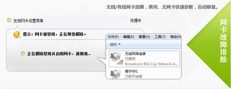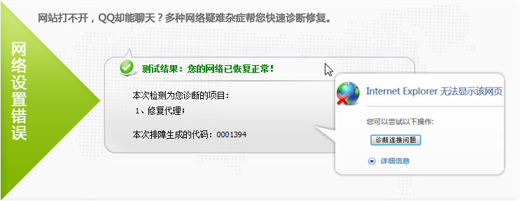 当您的网络出现故障时,例如IE无法打开网页、忽然断线、无法正常拨号,10000管家就会自动弹出提示并帮您诊断故障点。您只需按照排障向导的指引,即可找到故障原因并修复网络。