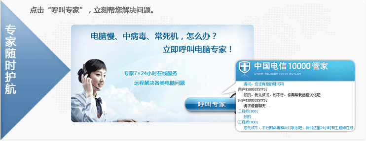 另外,10000管家还有专家远程电脑维修服务,7×24小时专家在线问诊,帮您解决各类电脑故障。如电脑常死机、常报错、运行慢、中了杀不掉的病毒等问题,专家都可以通过远程操作,帮您快速解决。
