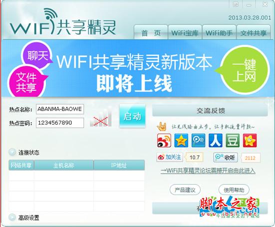 WIFI共享精灵是一款基于PC无线网卡应用的无线共享的软件。通过共享网卡WIFI信号,将笔记本设置成无线路由器,实现WiFi手机及PAD共享上网,无论你走到哪,只要带着安装了软件的笔记本电脑,就能实现即开即用,还可以避免忘带硬件产品的尴尬,随身wifi什么的都逊毙了!