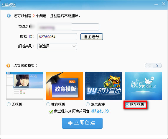 输入房间名称,选择房间类型和模板之后就可以进入频道了。