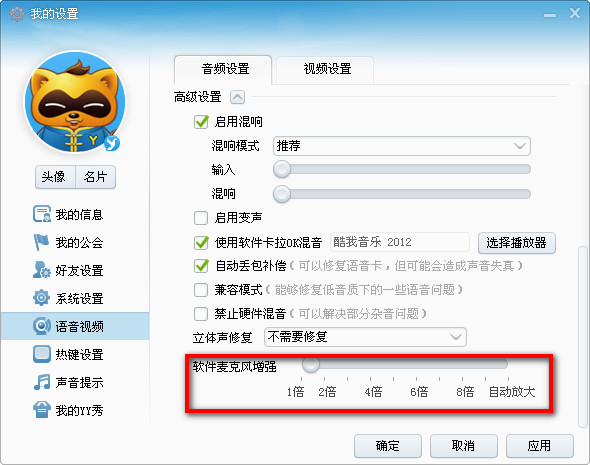 如果觉得麦克风声音很小,还可以通过软件进行放大,有放大倍数选择,有时也可以调到最右边让软件自动调节。
