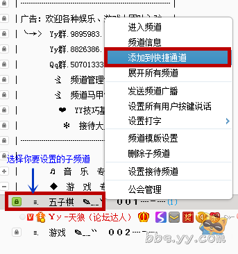 首先你要进入需要设置的频道。然后鼠标右键点击需要快捷进入的子频道,选择“添加到快捷通道”。