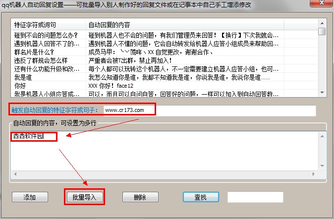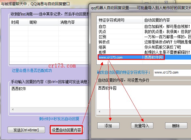 当对方恢复中含有"www.cr173.com"这一触发条件时,软件会发送恢复内容!