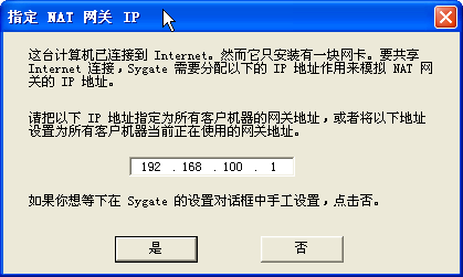 6、指定NAT网关IP。请注意:最好不要使用默认的192.168.0.1,因为当校园网内还有其他人使用sygate的默认网关IP时,就会导致IP冲突,使你的sygate无法启动。本例中为192.168.100.1