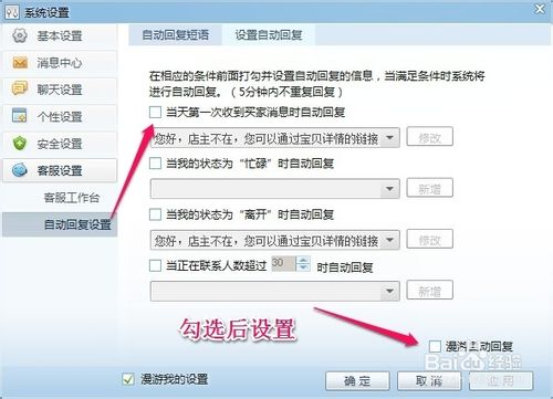 然后根据你的店铺情况,设置好哪些情景使用自动回复,也可以自行再修改一下。