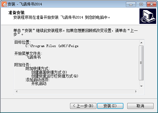 下载飞鸽传书2014版安装包,解压双击Feige2014_for_Windows.exe文件执行安装,在安装过程中,可以自定义程序安装路径、文件夹名称和快捷方式设置选项。