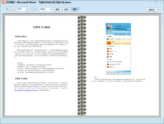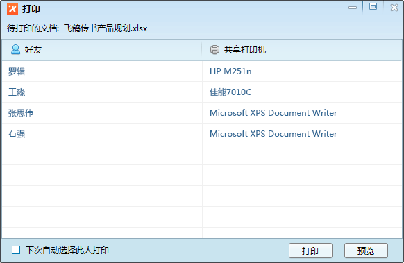 打开需要打印的文档或图片,选择 打印 -> 飞鸽网络打印机,选择你要选择的好友或打印机进行打印,也可以预览需要打印的文件。