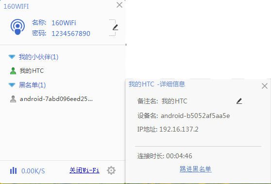 新加入的小伙伴,160WiFi会有接入提醒,加进来之后,点击用户名,可以看到他的详细信息,设备名、IP地址、连接时常,还可以自己设置备注名,如果不是自己的小伙伴,可以果断“踢进黑名单”,,他想蹭网的小心思就能扼杀在摇篮里了。