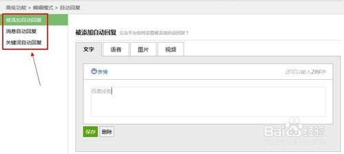 这两个模式在导航里面的高级功能里面可以看到,这两种模式之能选择一种使用!比较简单的就是自动回复了。