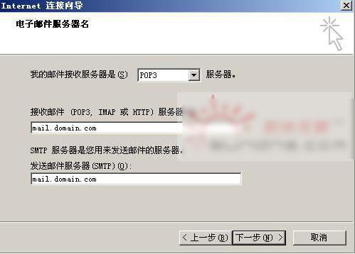5.在“POP3服务器”和“SMTP服务器”处填入"mail.你的域名"(例如您的域名是domain.com,就填写mail.domain-com),在“POP3账户名”处填入您的整个邮箱地址(如webmaster@domain-com注意要带上后缀@domain-com);