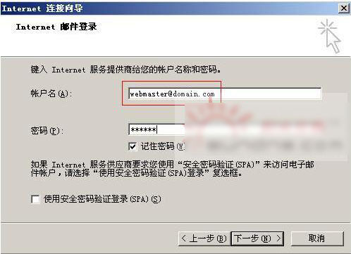 6.在帐户名对话框中输入您的帐户名webmaster@abc.com,即您的邮件地址全称,然后在密码框中输入本公司给您开通邮箱的密码。然后单击"下一步",再单击"完成"。
