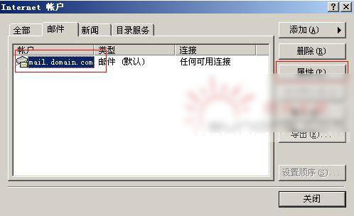 8、在Internet帐户中,选择“邮件”选项卡,选中刚才设置的账户,单击“属性”;