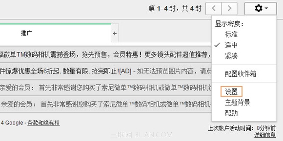 在浏览器中打开“Gmail”,在Gmail中点击右上角的“齿轮”,展开列表选择“设置”。