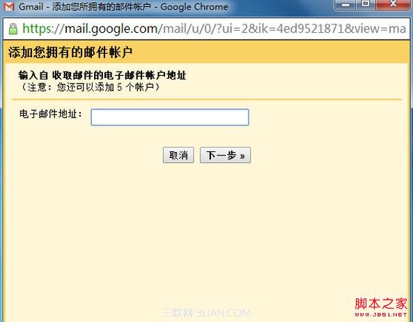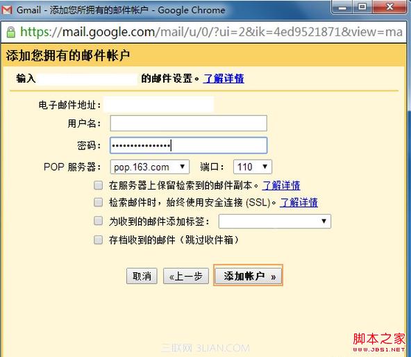 点击下一步之后,就可以对接收邮箱进行设置,在设置中用户需要填写邮箱的密码、pop服务器地址和端口,设置完该信息之后,用户就可以点击“添加账户”了。添加了账号之后,你的Gmail邮箱就可以接收来自其他邮箱的邮件了。