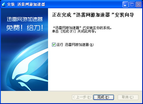 点击“完成”,网游加速器安装成功;如勾选了“运行”则会启动网游加速器。