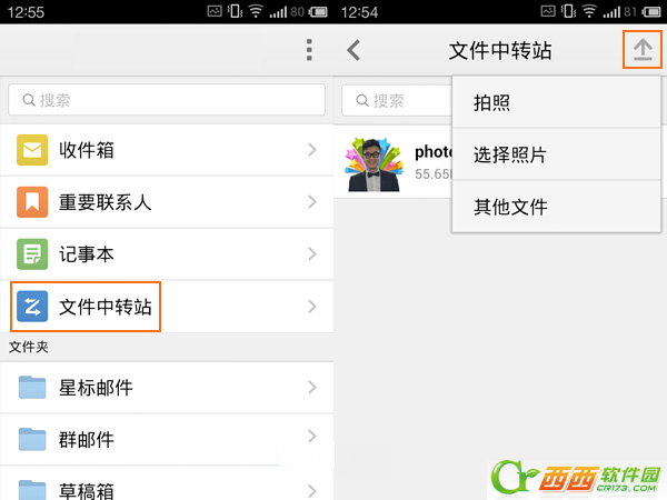 打开“手机QQ邮箱”软件,在列表中选择“文件中转站”。打开功能之后,点击右上角的“↑”按钮,进行文件的添加,添加的文件有拍照、相册文件和其他文件。选择一个进行文件类型进行添加。