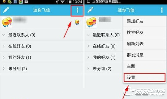 1)首先先下载一个迷你飞信,登陆飞信之后点击右上角的“...”,然后点击进入“设置”。