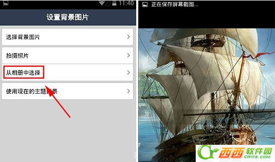 3)选择背景图片,可以选择系统上的背景,也可以选择手机上的背景,(以从相册中选择为例)选择完毕之后点击右下角的“发送”,就可以成功的设置好背景图片了。