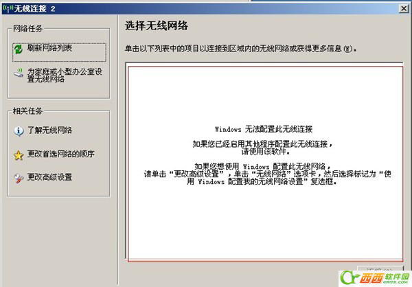 对于无线网卡被实用程序接管一般出现在XP系统的用户比较多:类似于无线网卡开关没有开启,但解决方法不同。如图: