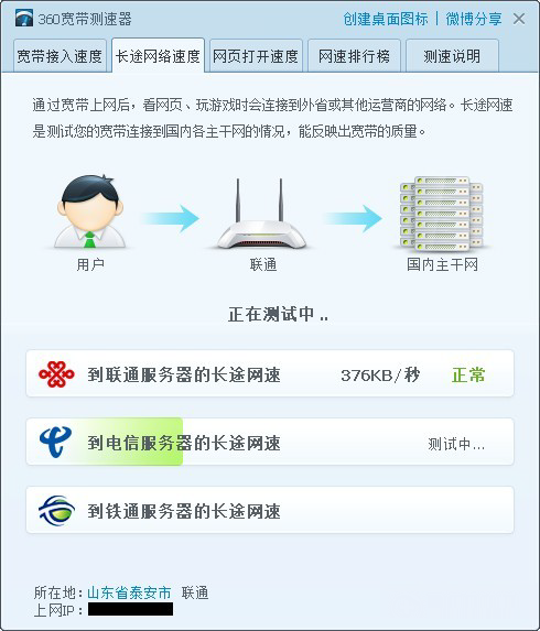 怎么使用360宽带测速器测试长途网络速度?长途网络是本宽带到其他宽带的测试速度,像国内的 电信 联通 铁通三大宽带。下面小编教童鞋们怎么测试长途网络速度:第一步:启动“宽带测速器”。点击宽带测速器界面上方的“长途网络速度”。