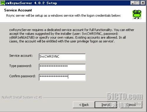 #auth users = SvcCWRSYNC # 认证的用户名,这里没有这行,则表明是匿名 #secrets file = /cygdrive/c/pass/rsync.passwd # 认证文件名二、客户端安装配置