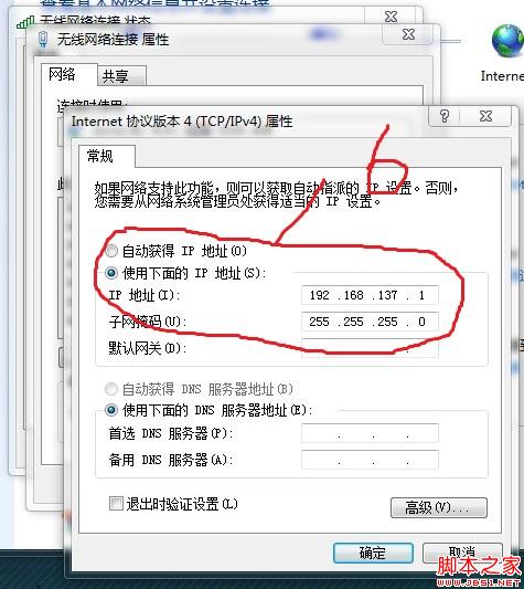 6:看这儿,把“自动获取”改成”使用下面的ip“(有可能已经这样了,一般是192.168.XXX.1,XXX一般为137,按照它的来)