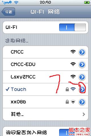 3:找到先前新建的无线(我这里是Touch),点击3处(圈错了是下面蓝色字样部分)
