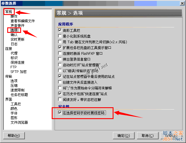 新版本FlashFXP(3.0以后版本):在FlashFXP中选择“属性→参数选择”(或者直接按下F6热键)打开“配置FlashFXP”窗口,切换到“选项”页面,勾选“当选中密码字段时显示密码”一项。接下来按下F4或者在菜单栏打开站点管理器,同样在站点列表中定位到想要查看密码的FTP站点,将光标停放在“密码”框中,原来以星号密文显示的密码立即以明文显示了。