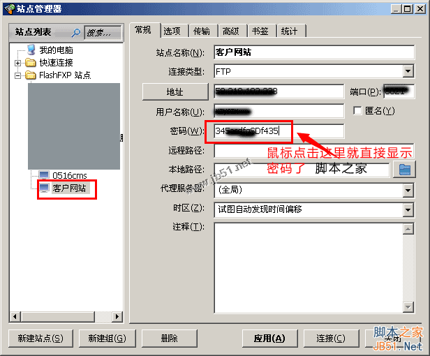 新版本FlashFXP(4.0以后版本):在FlashFXP中点击“属性→参数选择”打开“配置FlashFXP”窗口,切换到“选项”标签页,在上面选中“在选择密码字段时展现密码”。接下来打开站点管理器,同样在站点列表中定位到想要查看密码的FTP站点,将光标停放在“密码”框中,原来以星号显示的密码立即以明文显示了。