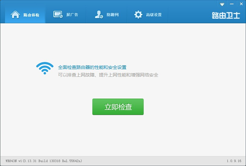 打开界面,点了立即检查。网路故障检测,可以一键检测网络不通的原因,并修复之;还可自动升级路由器,实时检测路由器厂商ROM,自动升级到最新的ROM版本。