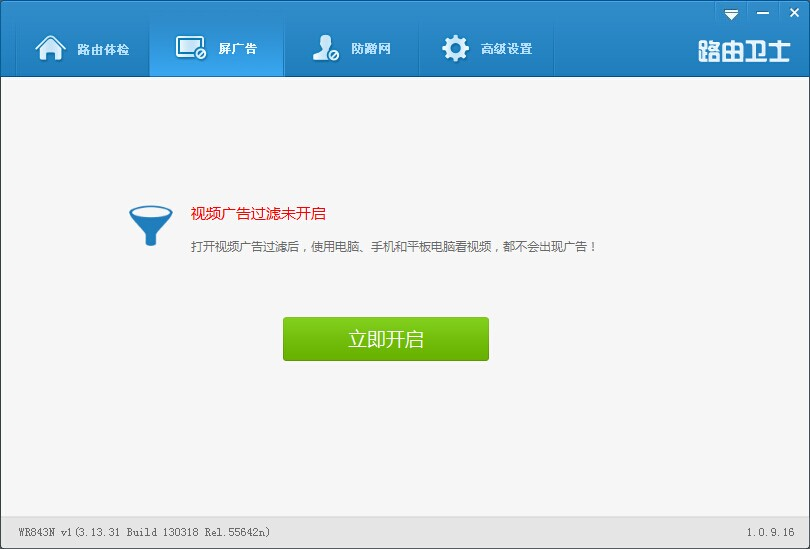 打开屏广告界面,点击立即开启,路由卫士自动为您屏蔽各种视频广告,让手机、电脑和iPad看电影不再怕被广告骚扰啦,路由卫士保护您的路由器不被劫持!